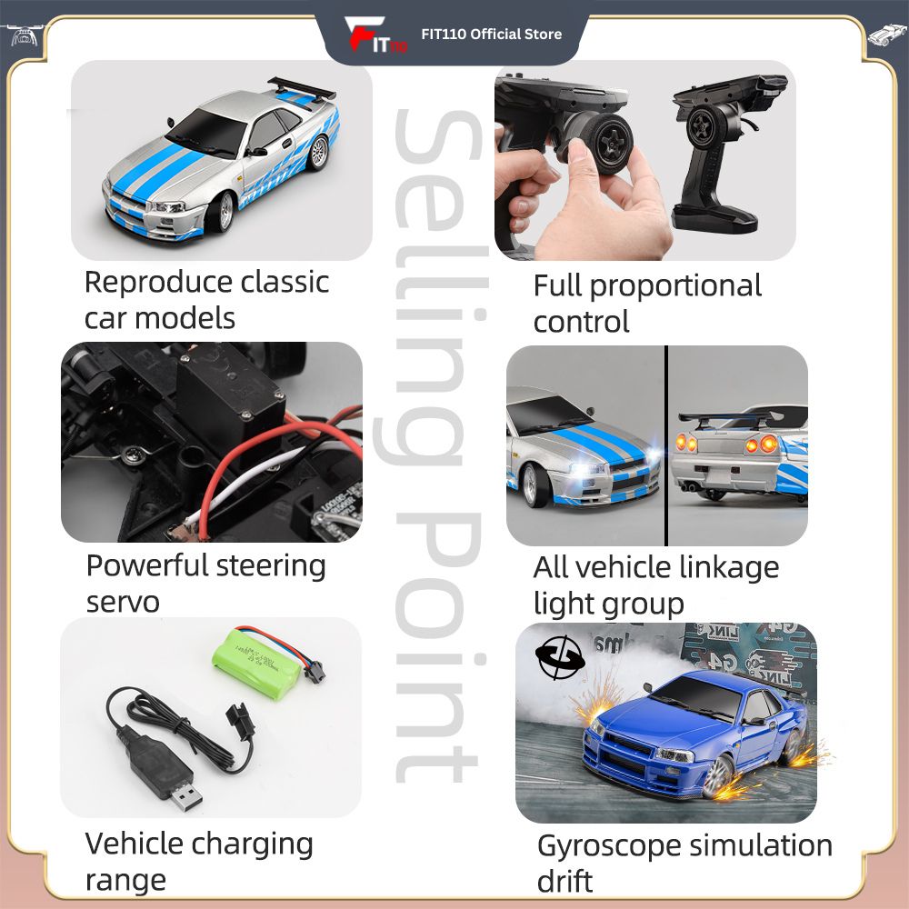 Skyline GTR R34 Drift Car, Metal Alloy Shell, RC drift car with Gyroscope.